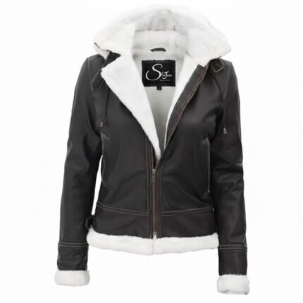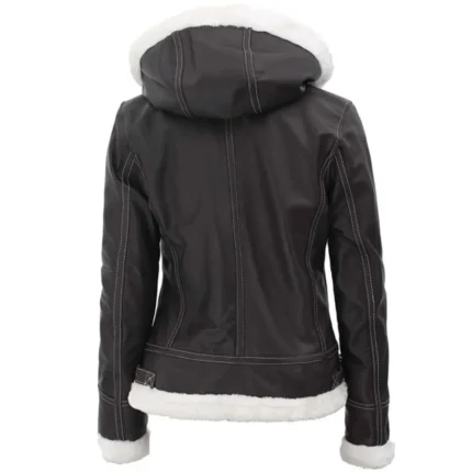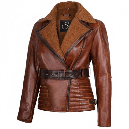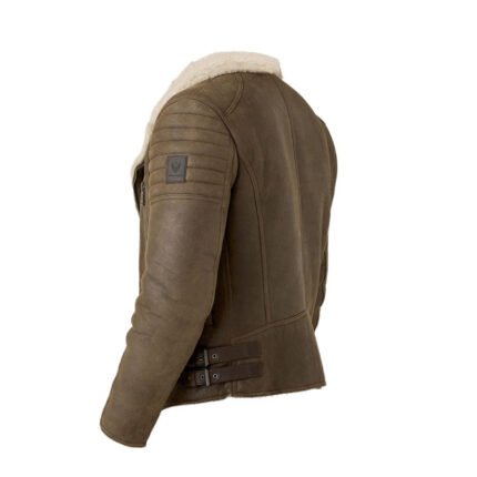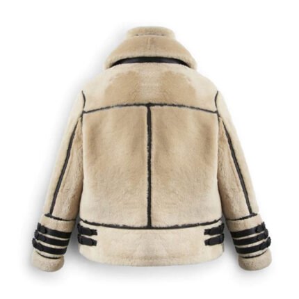 - Doubled removeable shearling collar with undercollar leather buckles.